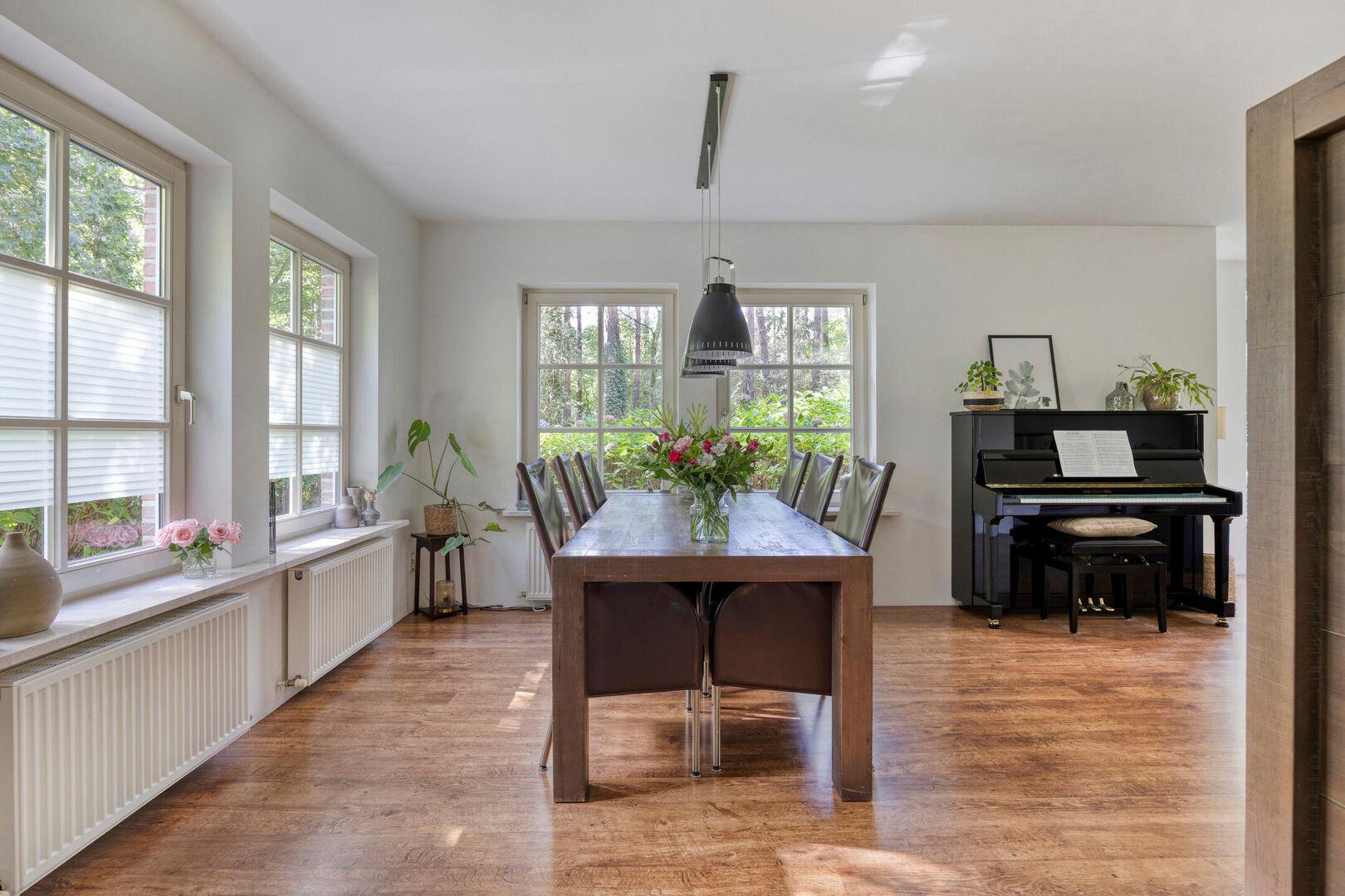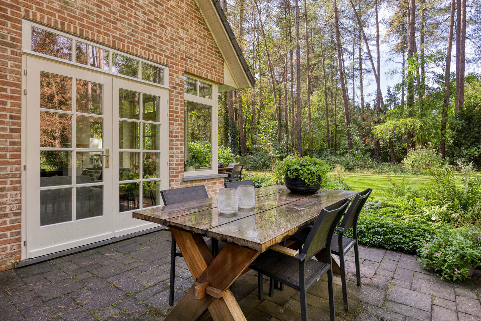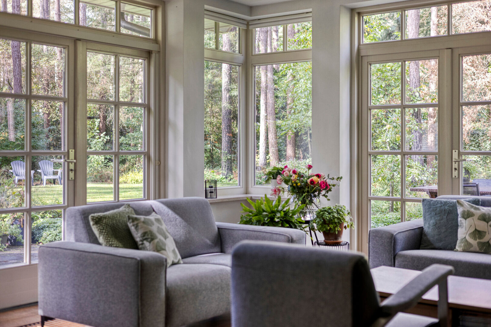 De twee openslaande tuindeuren versterken het wooncomfort en creëren een natuurlijke overgang naar de tuin. Zo wordt het buitenleven een verlengstuk van uw woonkamer en geniet u optimaal van de groene omgeving.