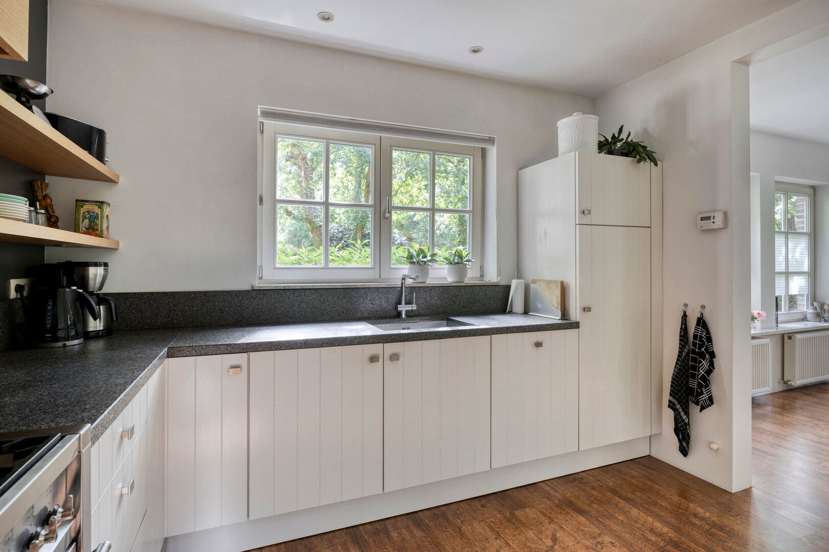 De open keuken ,voorzien van natuurstenen blad, is uitgerust met de nodige toestellen, waaronder een 6-pits gasfornuis met oven, vaatwasser, dampkap en koelkast en staat in directe verbinding met de woonkamer. Vanuit de keuken heb je een fraai zicht op de tuin, waardoor koken hier echt een plezier wordt. De open indeling zorgt bovendien voor een aangename interactie tussen keuken en leefruimte.