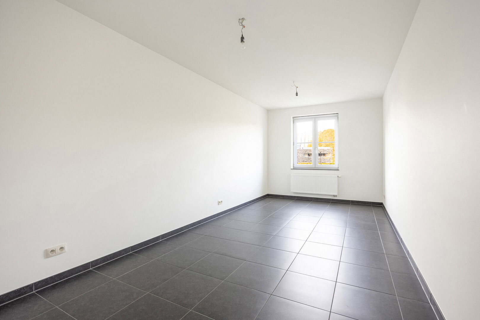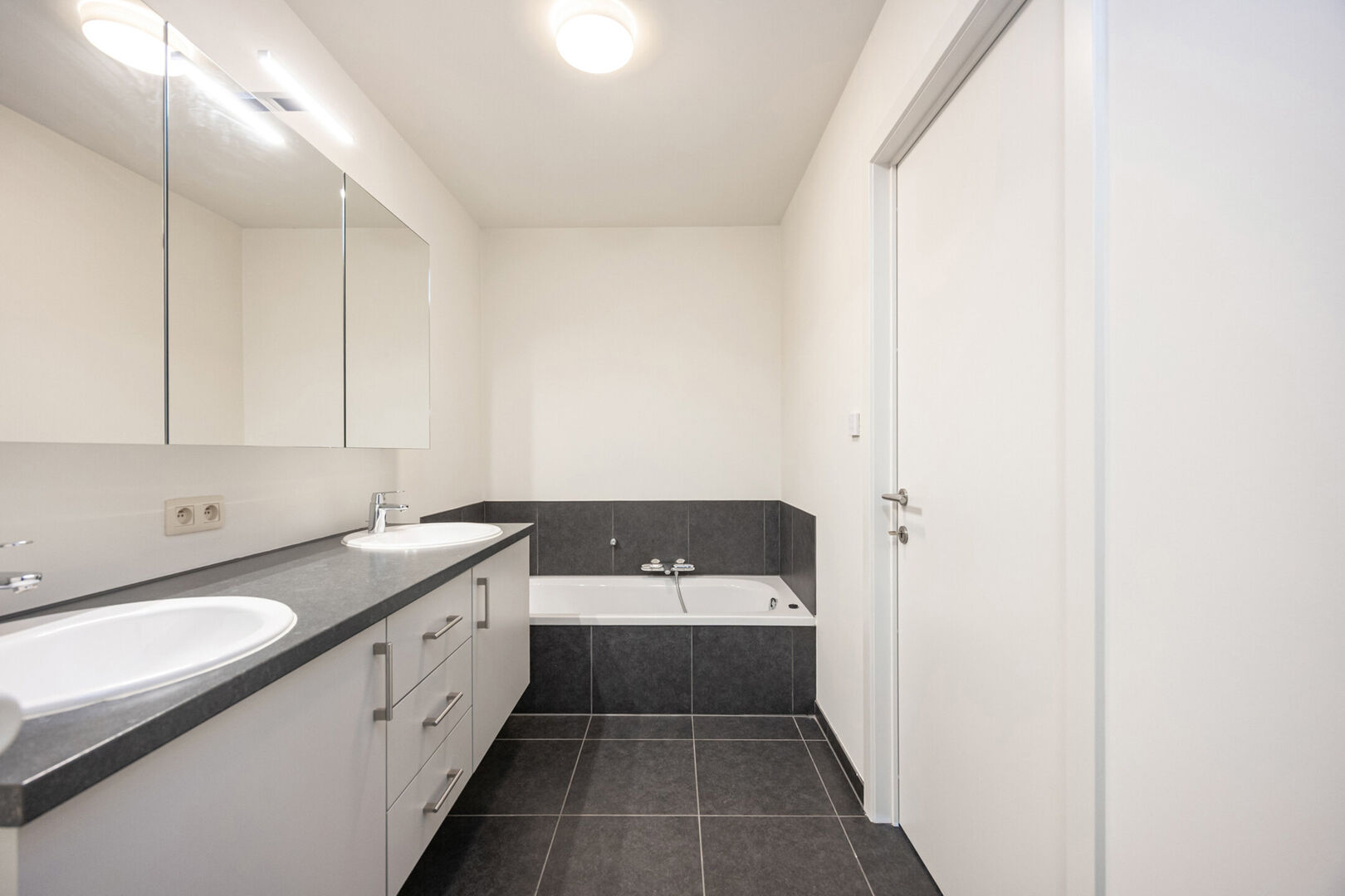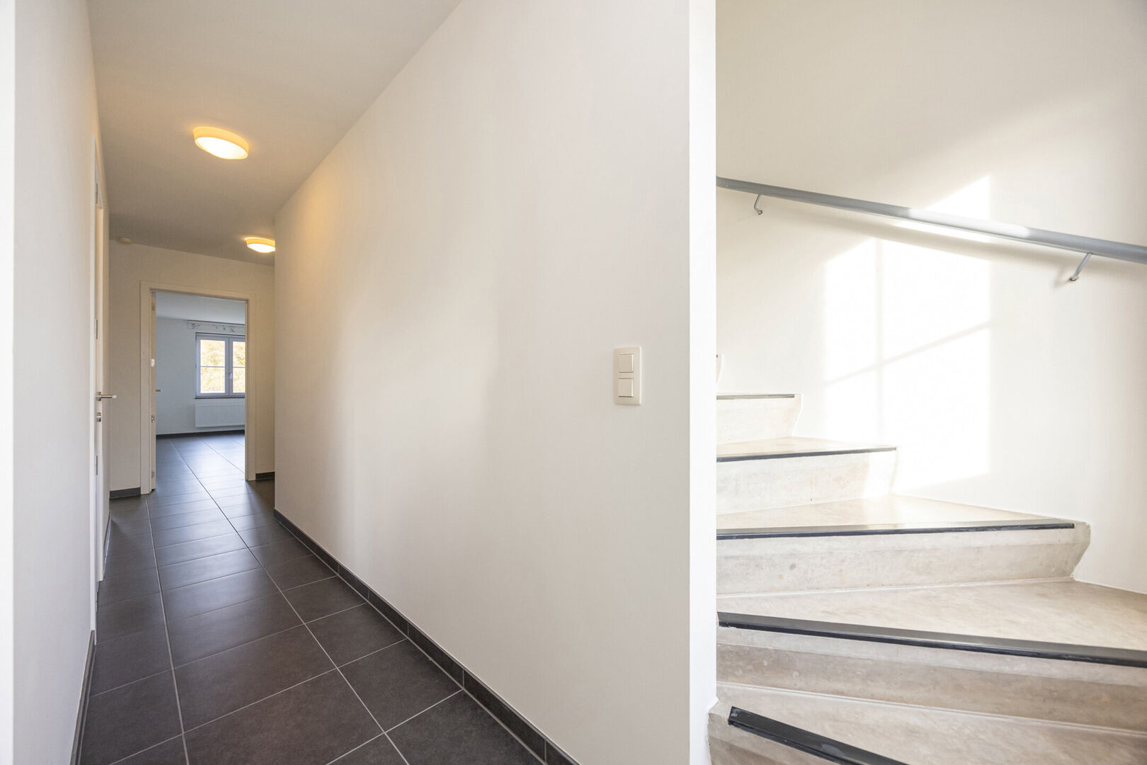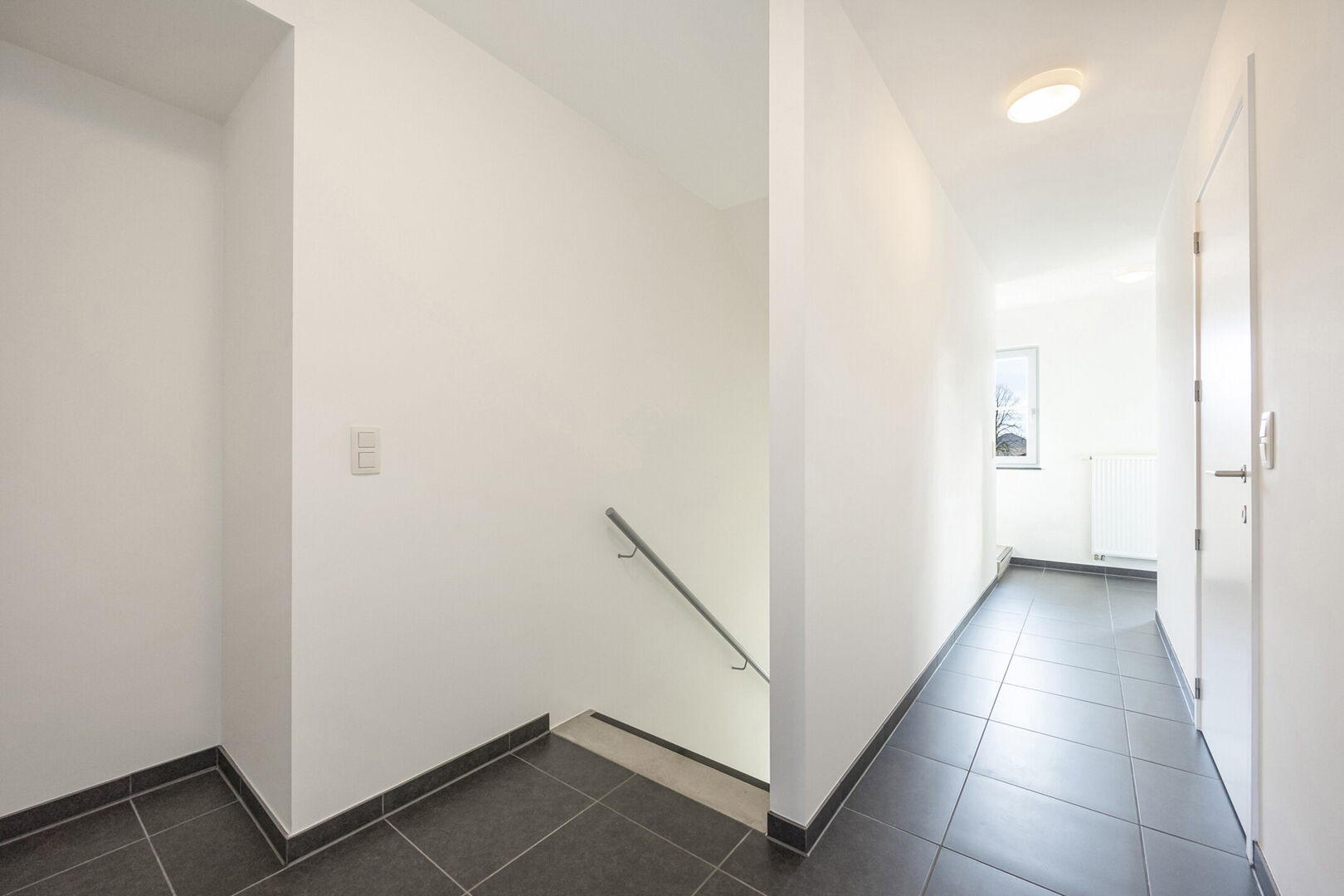 Via de voordeur stapt u de inkomhal binnen. De strakke afwerking, het gebruik van neutrale kleuren en de moderne binnendeuren zetten de toon voor de rest van de woning. In de hal vind u het toilet met fontein, de garderobekast en toegang tot de woonkamer met open keuken. Zodra u de woonkamer binnenkomt, valt het direct op hoe licht en ruim deze leefruimte is. Dankzij de raampartijen en de dubbele openslaande tuindeuren komt er een zee van daglicht binnen.