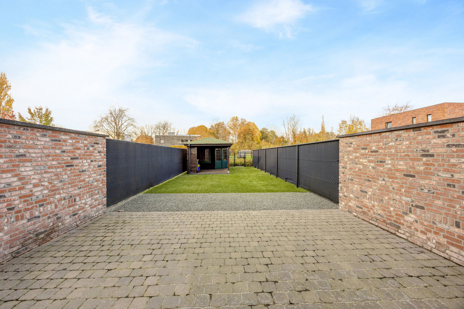 De achtertuin is onderhoudsvriendelijk en volledig omheind, aangelegd met sierbestrating, kunstgras en een tuinhuis met een afdak waar u gezellig kunt ontspannen.