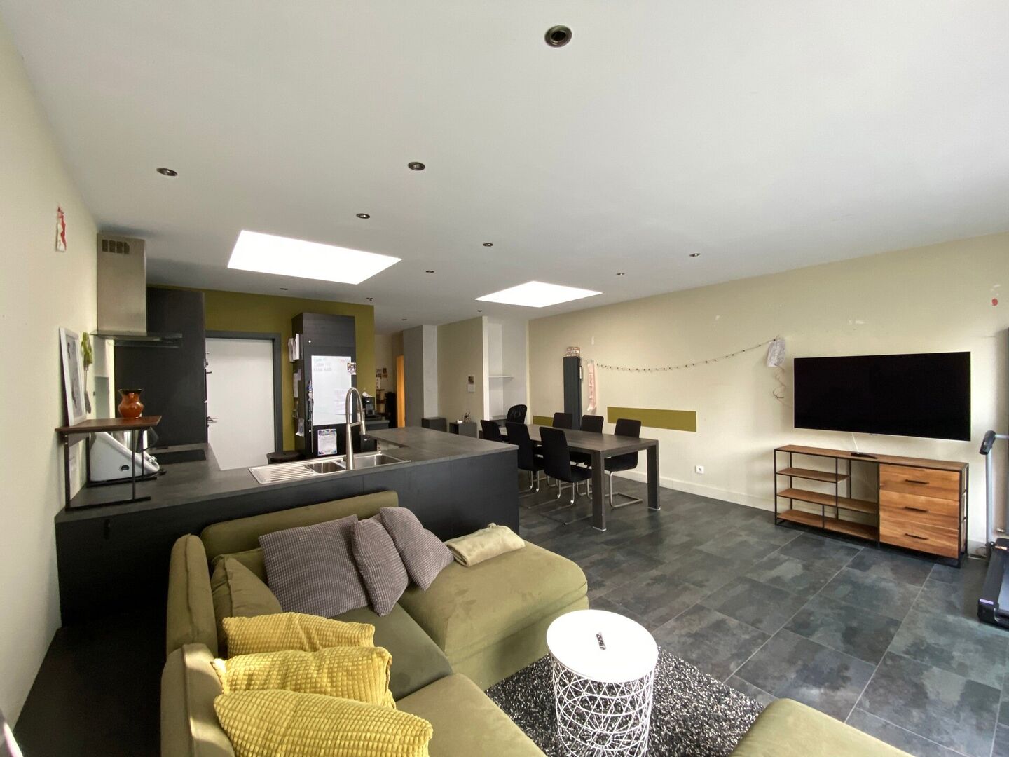 Inkom , lichtrijke leefruimte met volledig ingerichte open keuken, beneden nog een ruim bureel van ca 12 m2 of mogelijk 5 de slaapkamer.