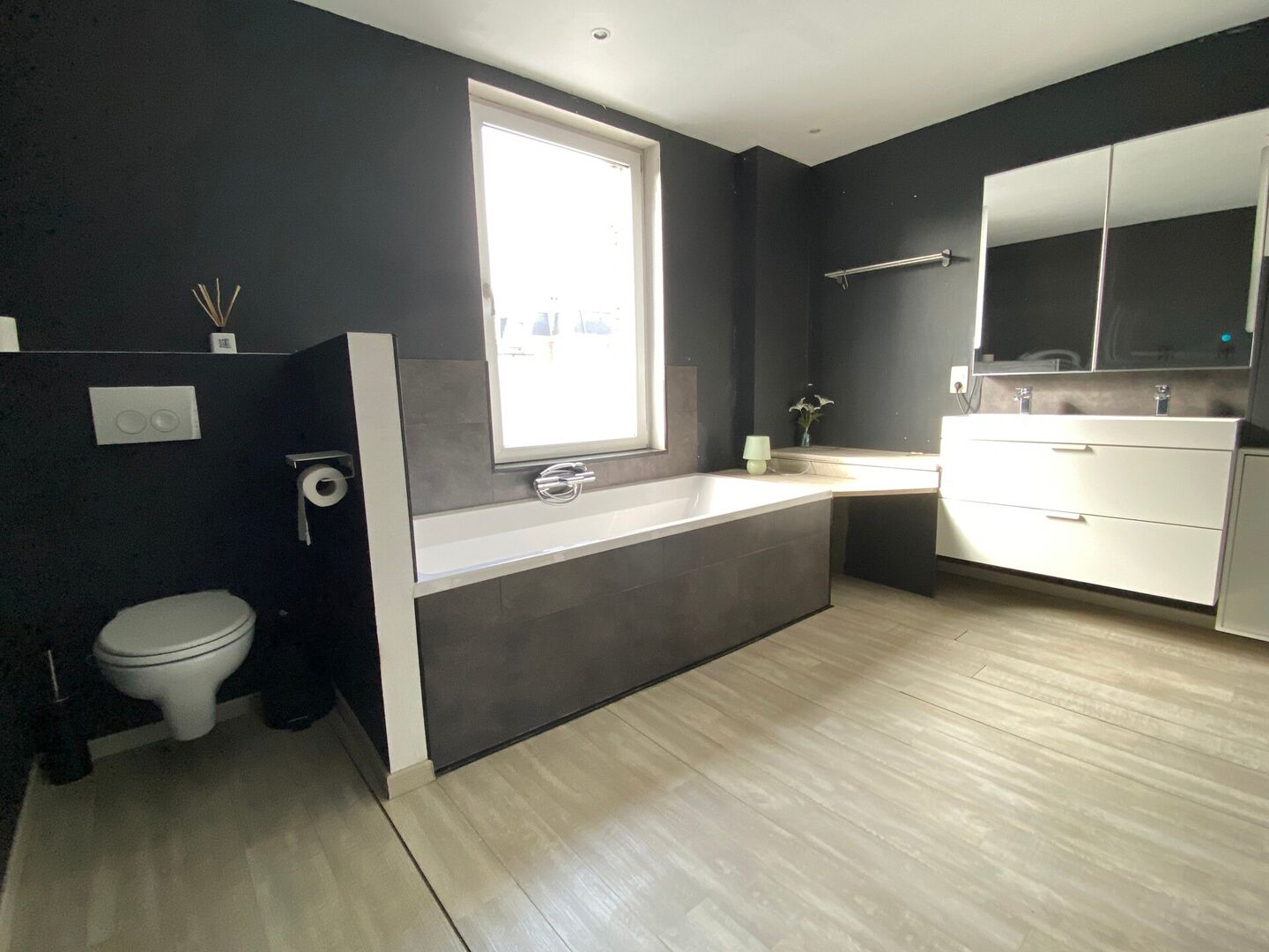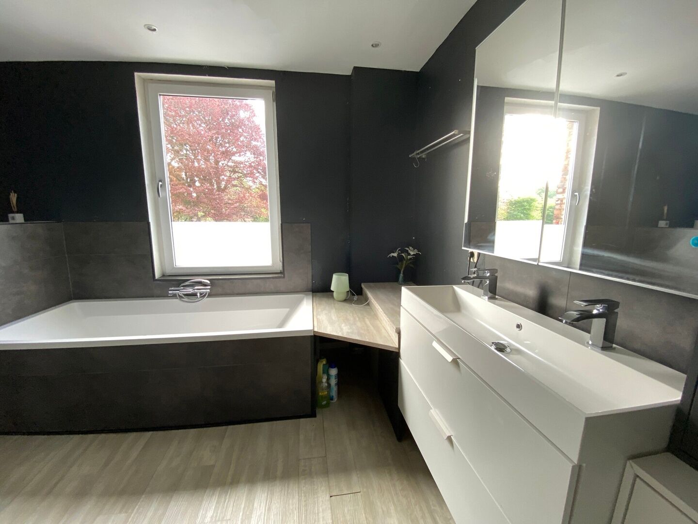 Het eerste verdiep heeft 2 slaapkamers op laminaat en een grote badkamer met ligbad en inloopdoiuche .