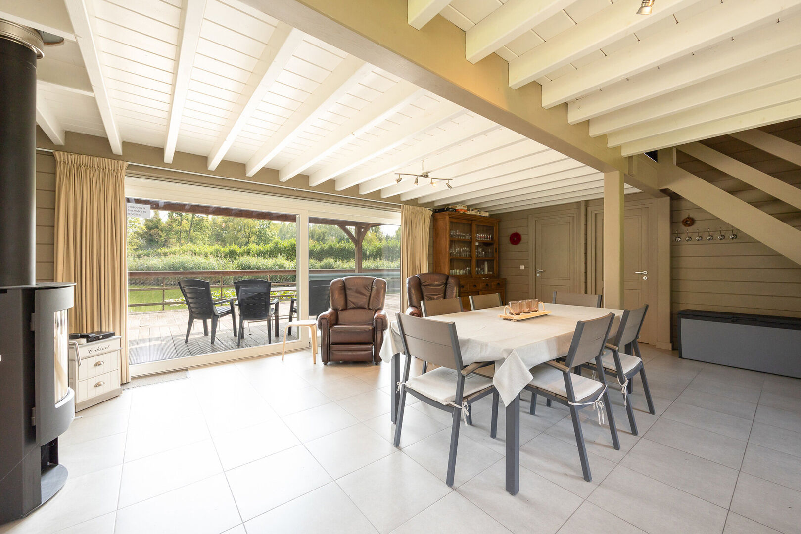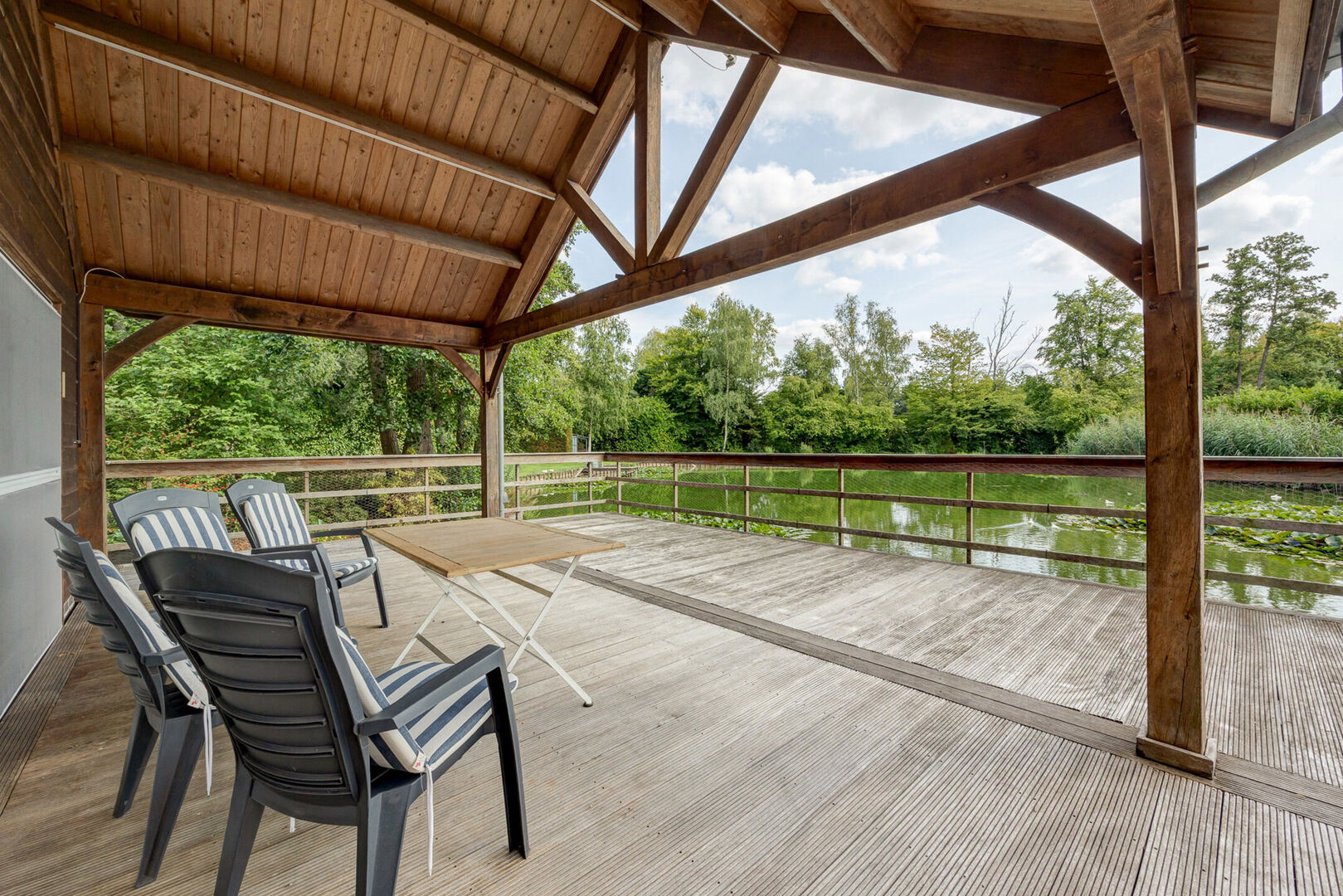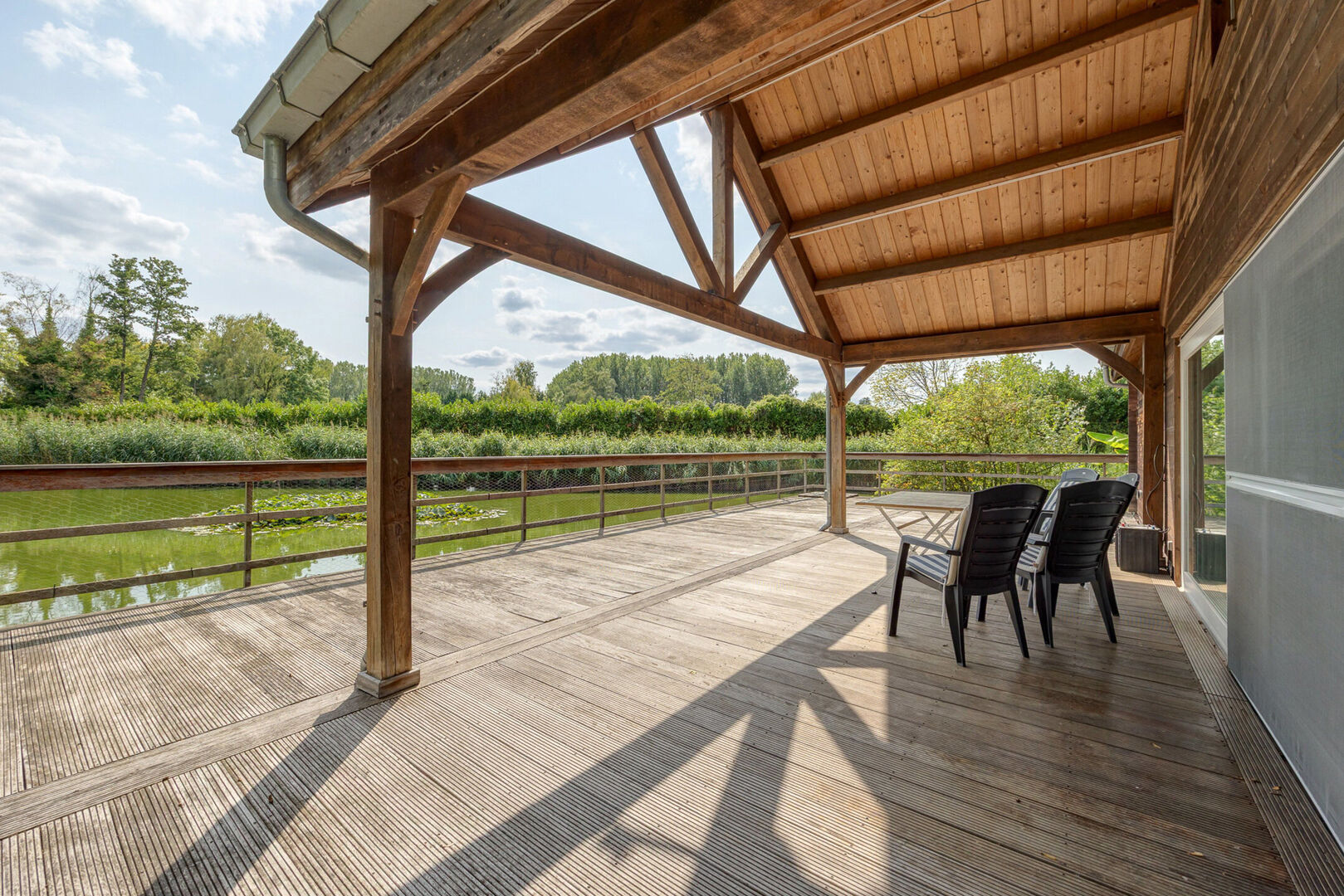 Via de schuifdeuren komt u uit op het ruime terras (78 m² )dat deels over de prachtige vijverpartij heenloopt. Het terras is gedeeltelijk overdekt (20 m²) in de stijl van de woning, waardoor u het hele jaar door optimaal kunt genieten van het uitzicht en de natuur.