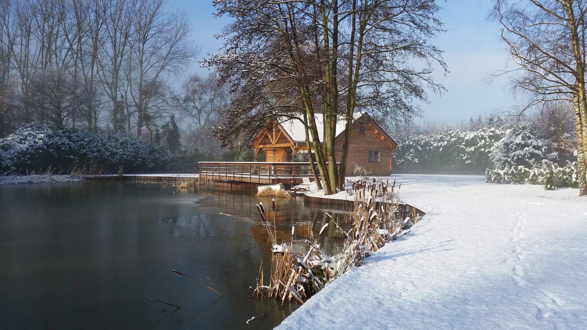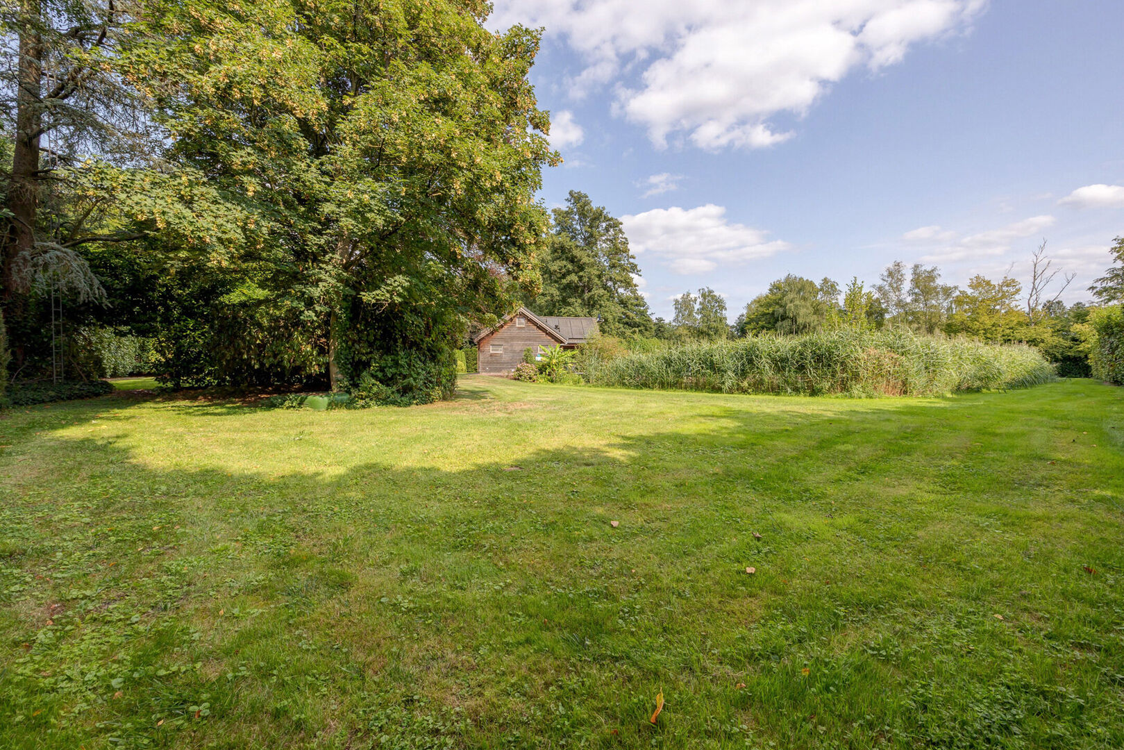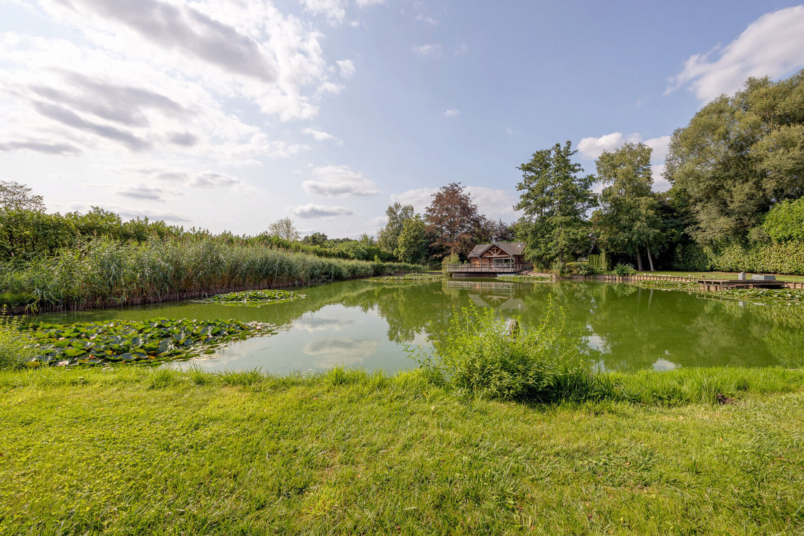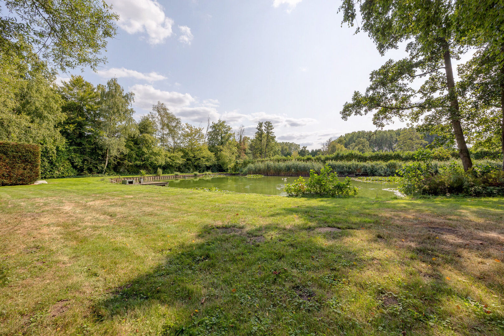 Deze locatie biedt de mogelijkheid voor een mooie wandeling over het perceel, een plek onder de beukenbomen waar schaduw, gefilterd zonlicht, het zachte geritsel van de bladeren en natuurlijke schoonheid samenkomen waardoor u volop kunt genieten van de omgeving. Het terrein kenmerkt zich door veel groen en prachtige bomen, met rietranden langs de vijver die zorgen voor een rustgevende sfeer.